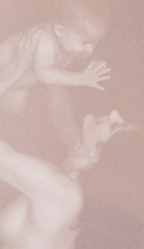 This sepia-toned profile of a young mother with her chubby thirteen-month old just after his bath is one of my favorites. I’m holding my naked little angel up over head which allows the viewer to see our faces, his round cheeks and button nose, a sprig of blonde silken hair, nose to nose with my own angular face sans the passage of time. His dimpled fingers are splayed in a pat-a-cake clap. For me, the photo captures a timeless truth: a sweet boy, his mother’s delight.
